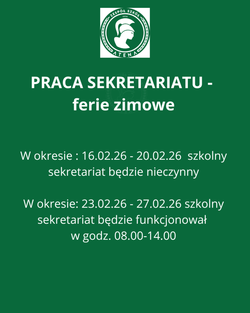 Kategorie Aktualności GODZINY PRACY SEKRETARIATU -okres ferii zimowych Autor wpisu Autor: SWK Data wpisu 13/02/2026 ← BohaterON w SP ATENA → PRZERWA WIELKANOCNA